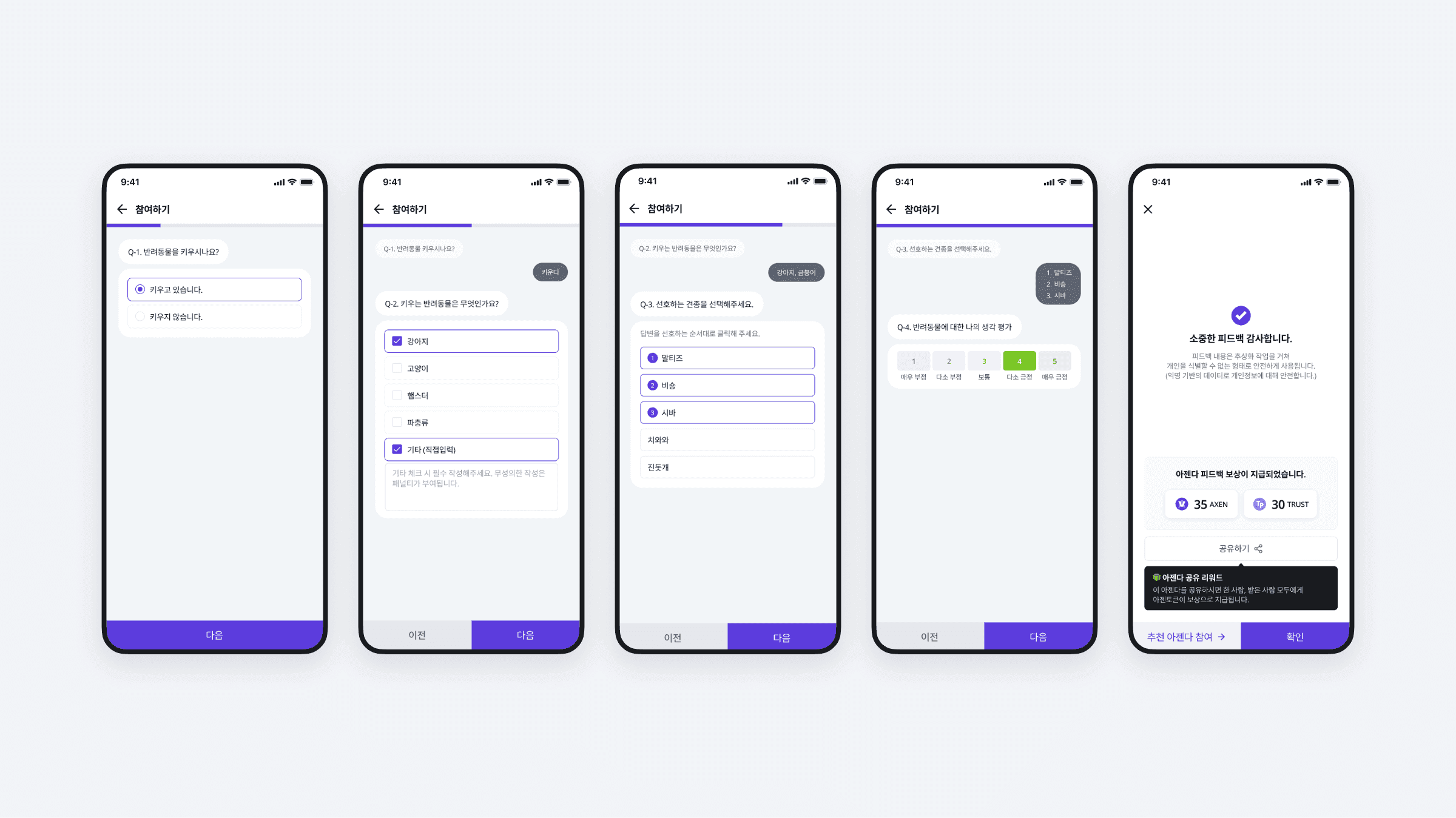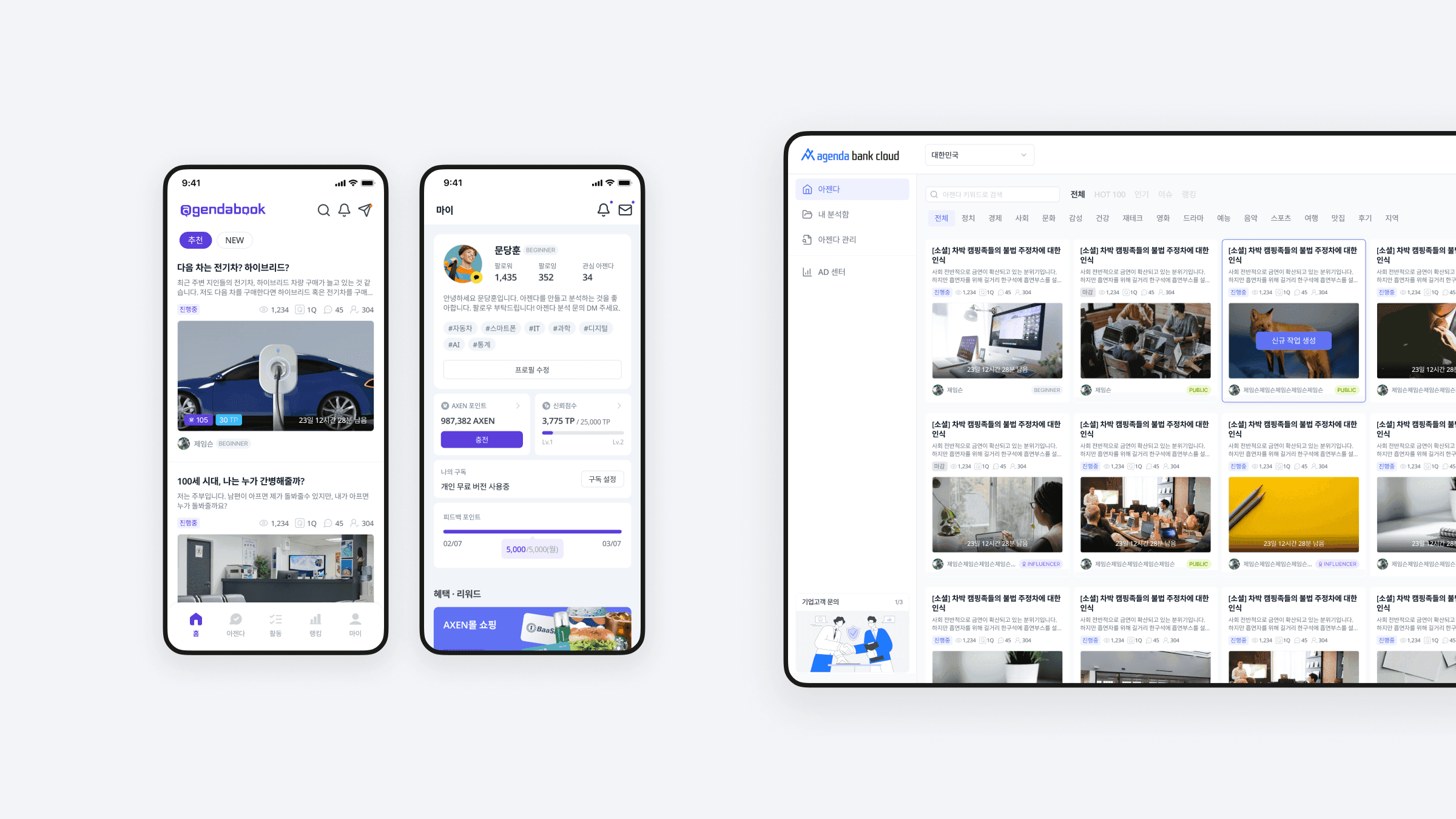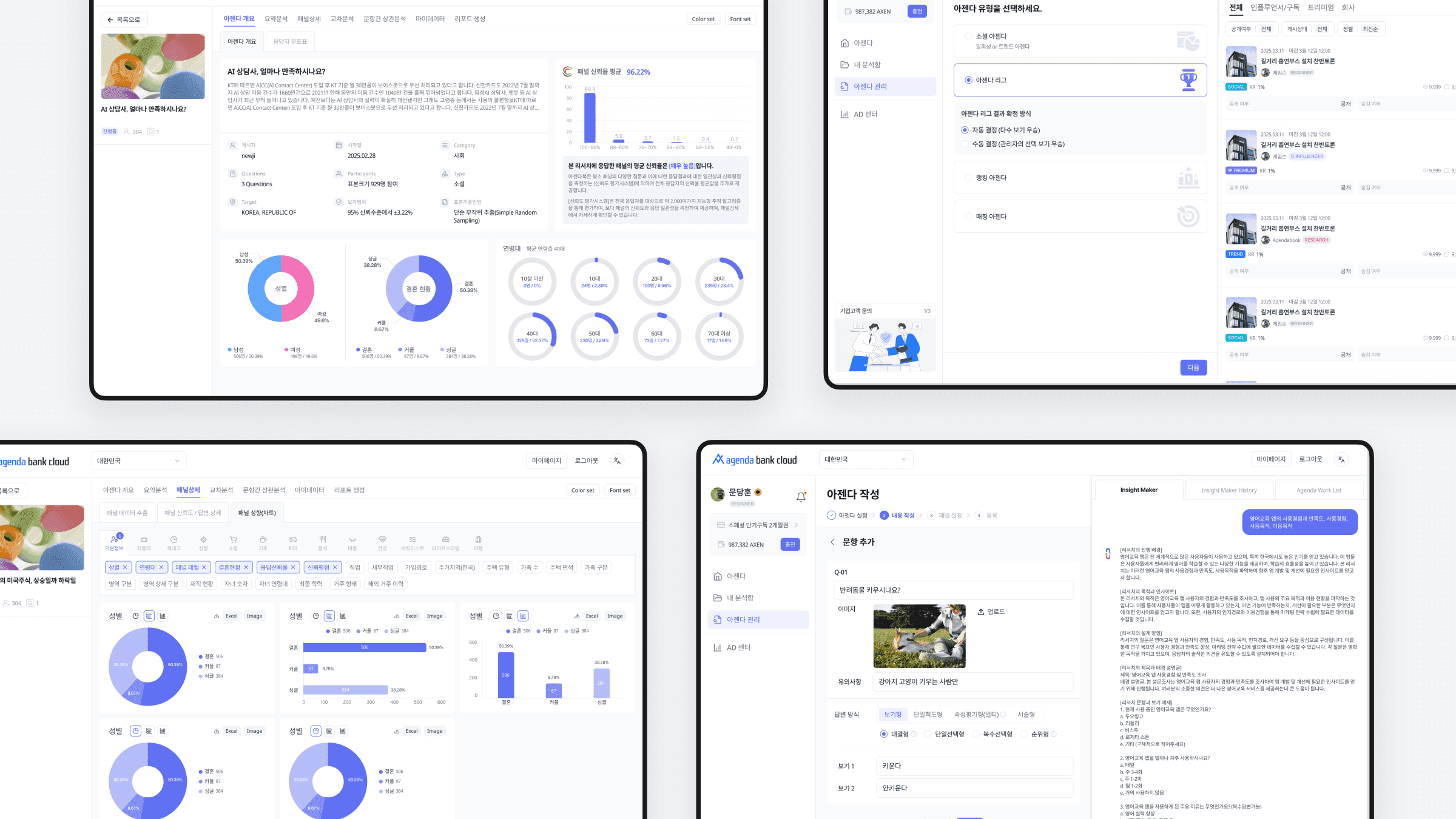 아젠다북은 사용자 인사이트를 효율적으로 수집·분석하기 위해 설계된 리서치 플랫폼입니다. 모바일 앱과 웹 인터페이스 전반을 사용자 중심으로 기획·디자인하여 리서치 과정을 직관적으로 구성했습니다. 웹 대시보드에서는 다양한 차트와 시각화 구조를 통해 복잡한 데이터를 쉽게 이해할 수 있도록 설계했으며, 기능과 디자인이 유기적으로 연결되도록 구현했습니다.