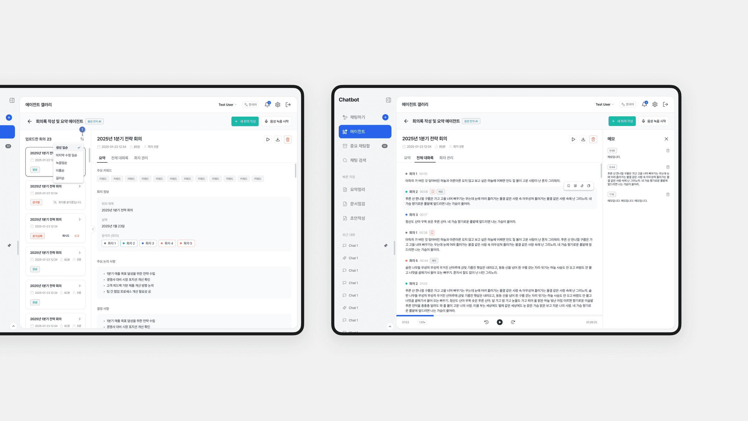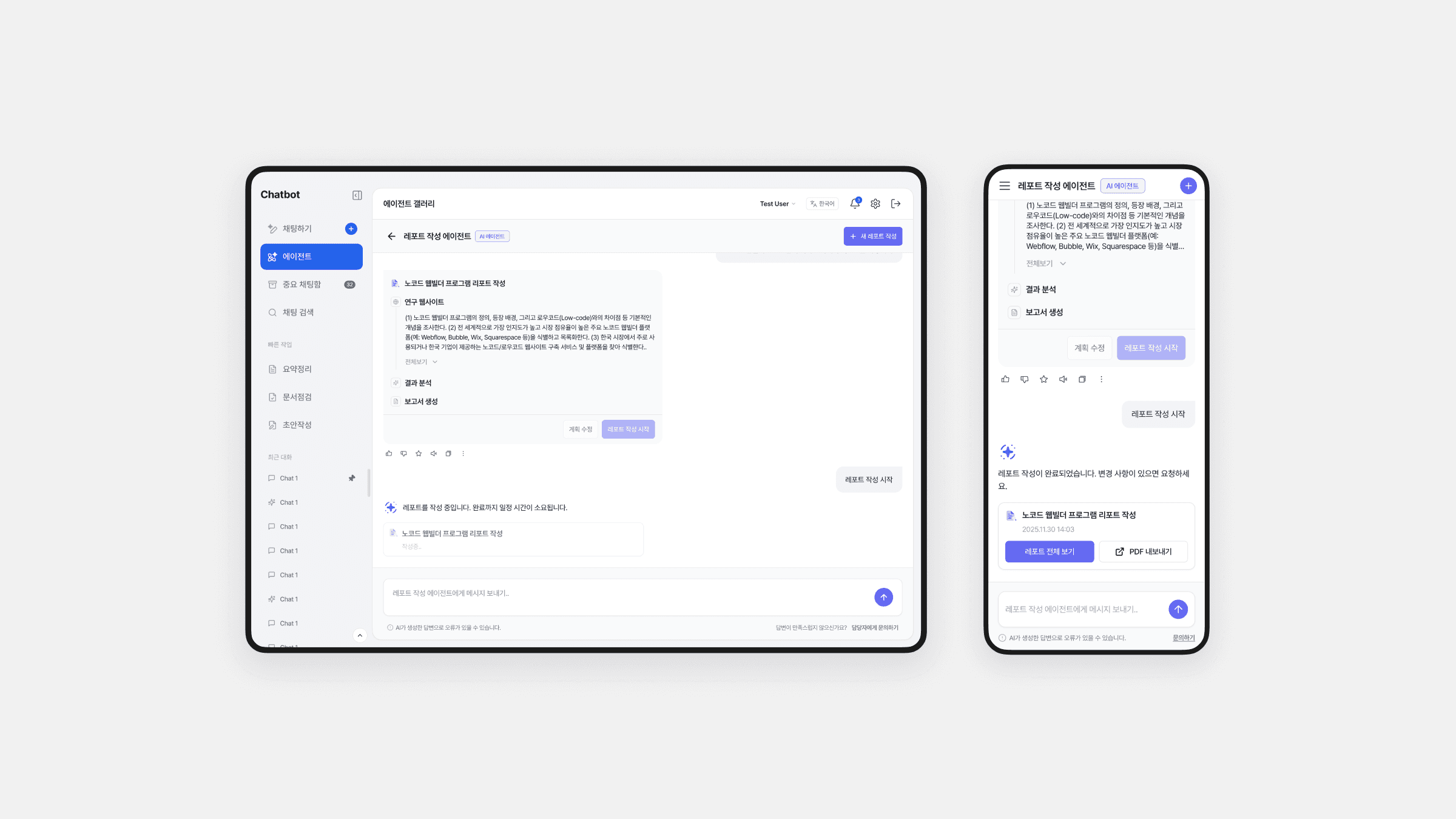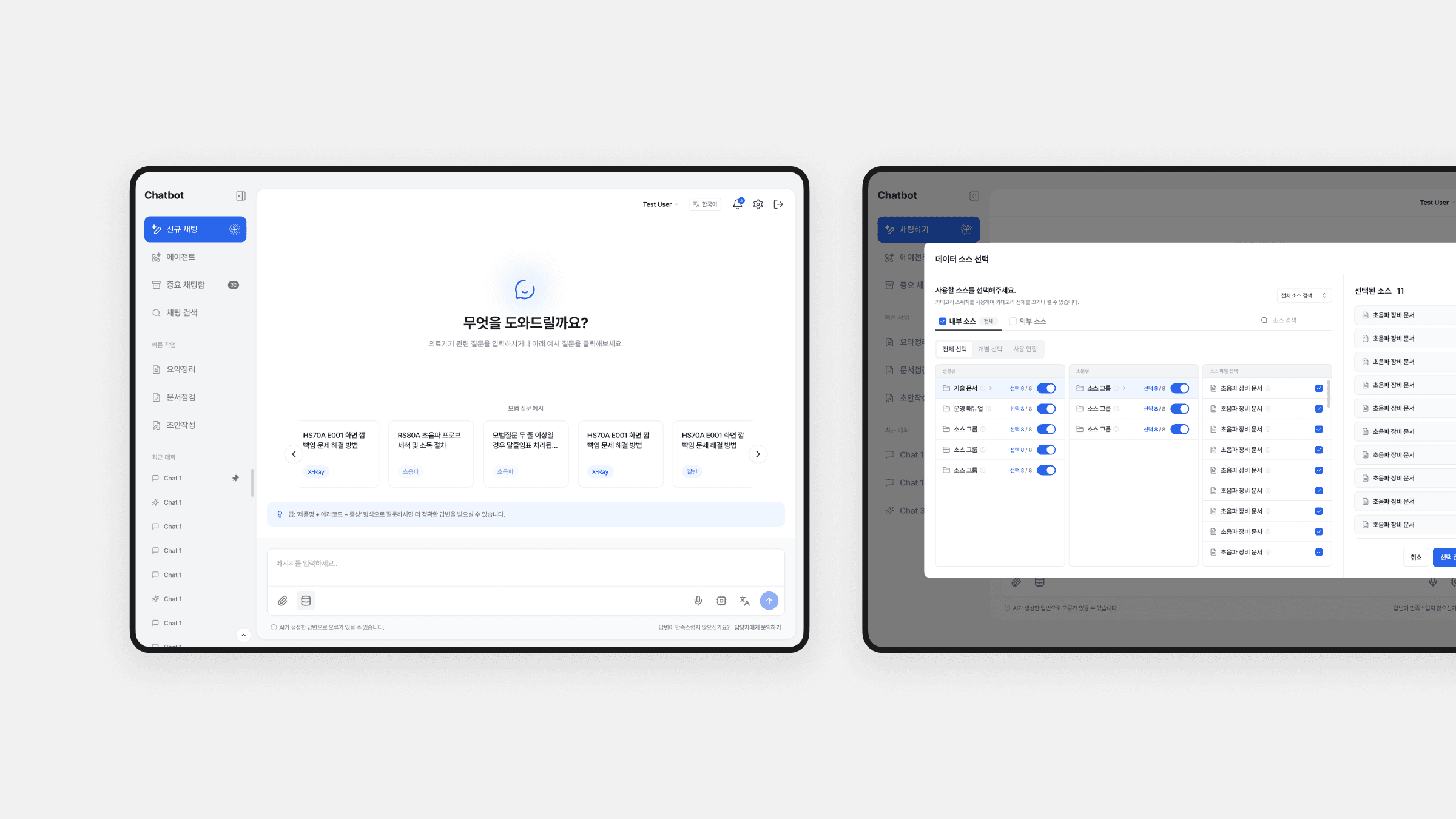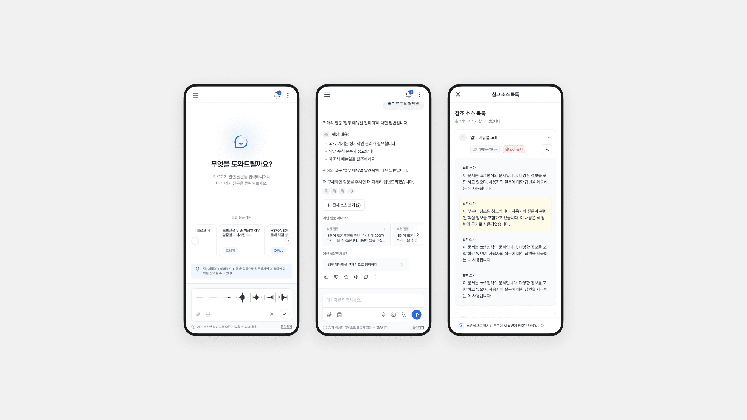 본 프로젝트는 의료 업무 지원, 리포트 작성, 회의 요약을 하나의 대화형 인터페이스에서 처리할 수 있도록 설계된 AI 챗봇 서비스입니다. 사용자는 의료 문서와 내부 데이터를 기반으로 분석 결과를 확인하고 구조화된 보고서를 생성할 수 있습니다. 데이터 출처와 응답 흐름을 명확히 보여 신뢰성과 추적 가능성을 높였으며, 다중 패널 구조와 가이드형 UX로 복잡한 전문 업무에서의 인지 부담을 줄였습니다.