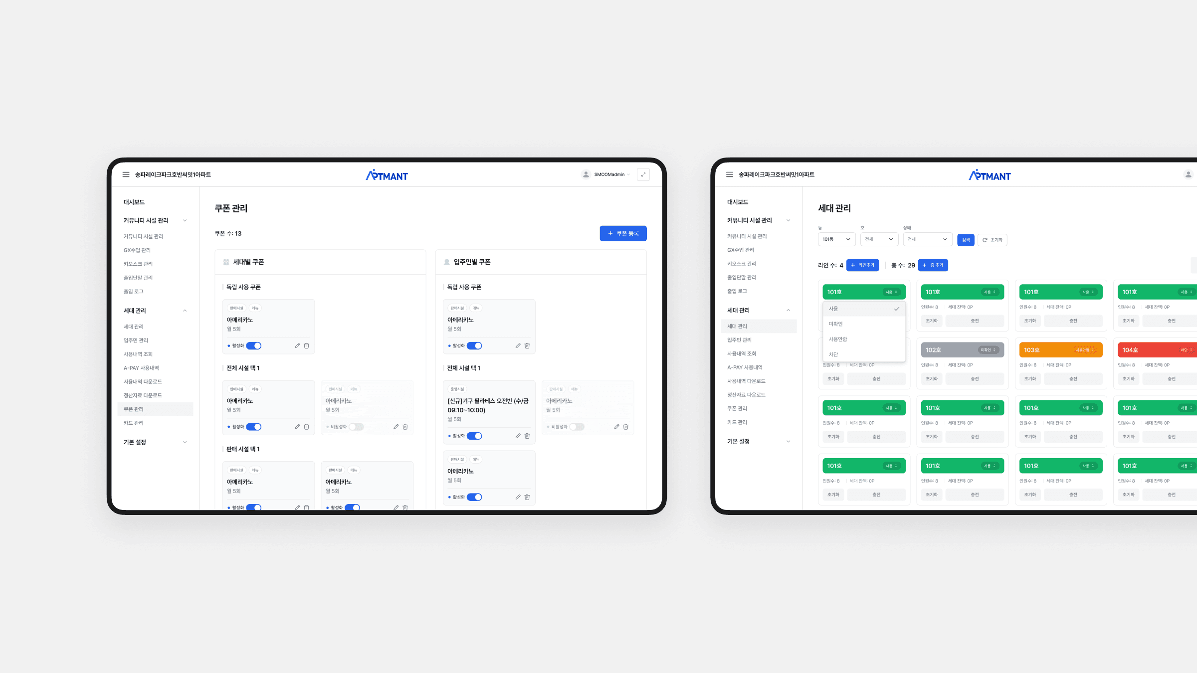 This web-based admin dashboard was designed for apartment management staff and operators to efficiently manage community facilities, reservations, household data, payments, coupons, and usage analytics, prioritizing high information density while maintaining clarity through structured layouts, consistent UI components, and clear visual hierarchy, enabling administrators to quickly scan data, apply filters, and complete repetitive operational tasks with minimal cognitive load.