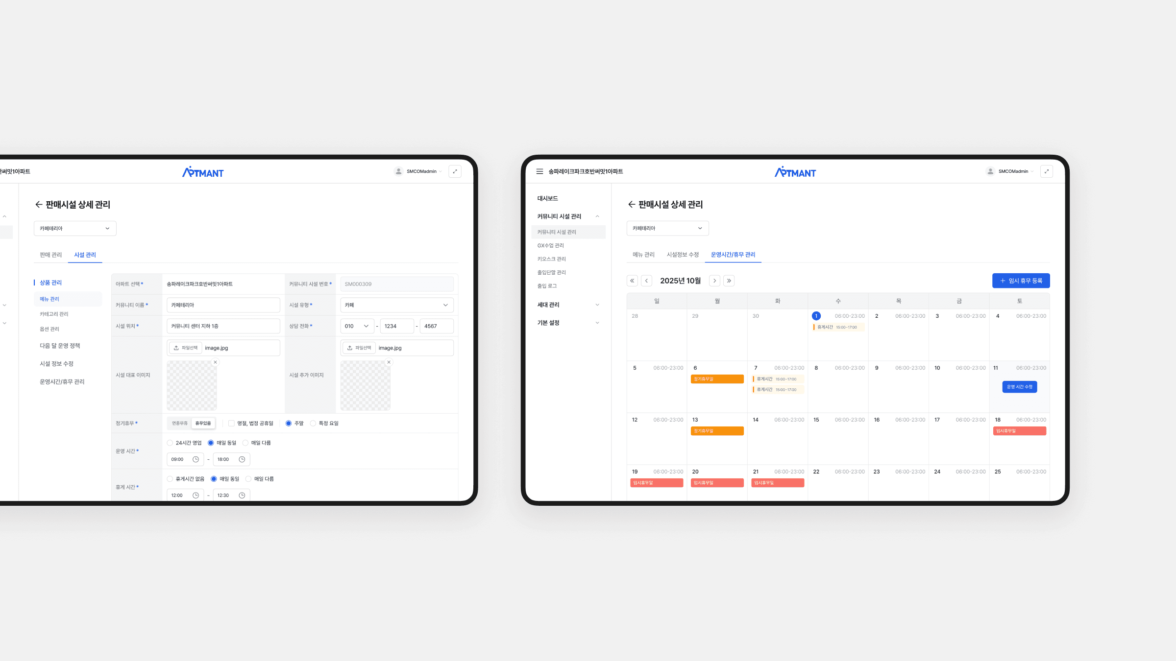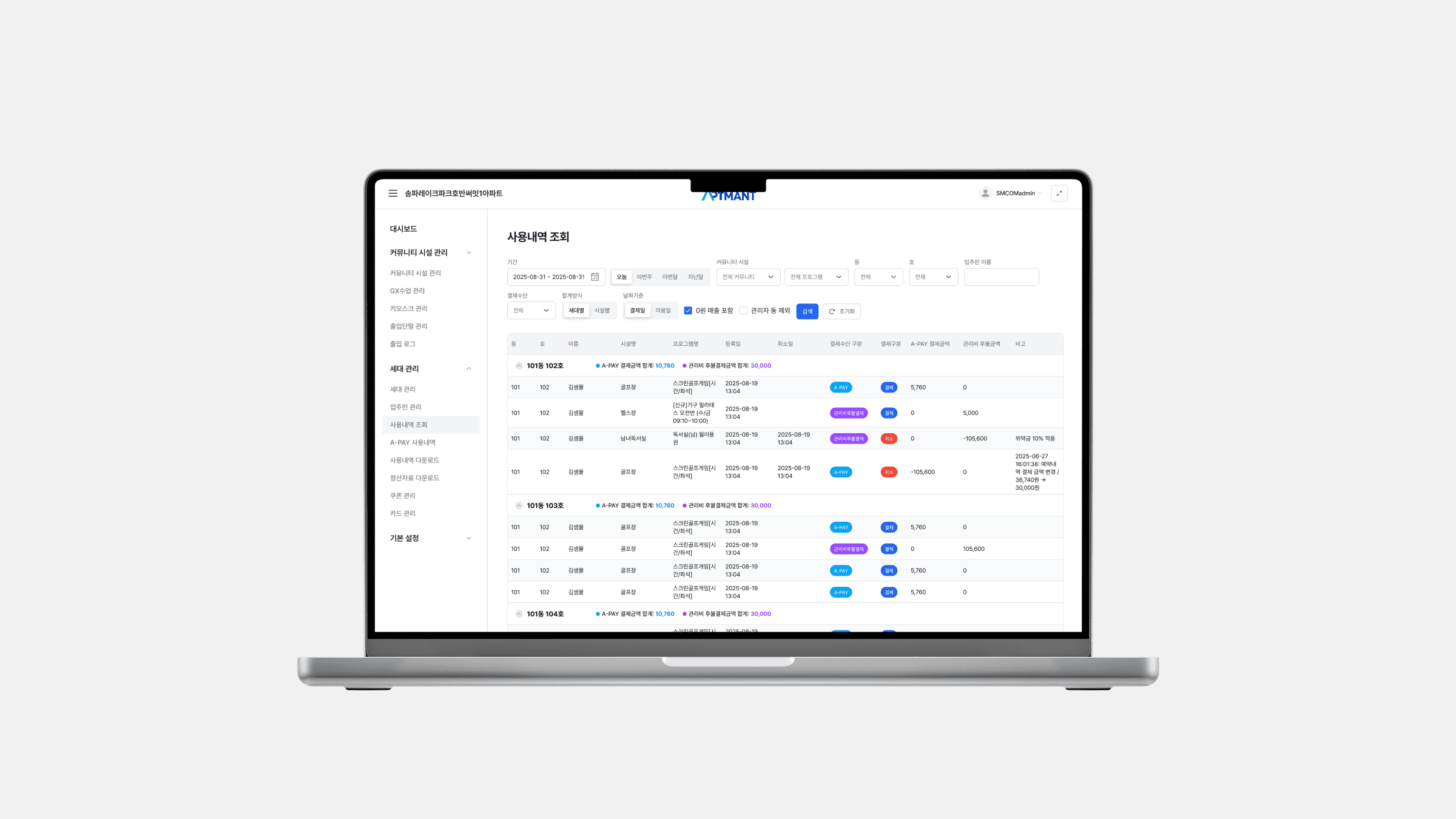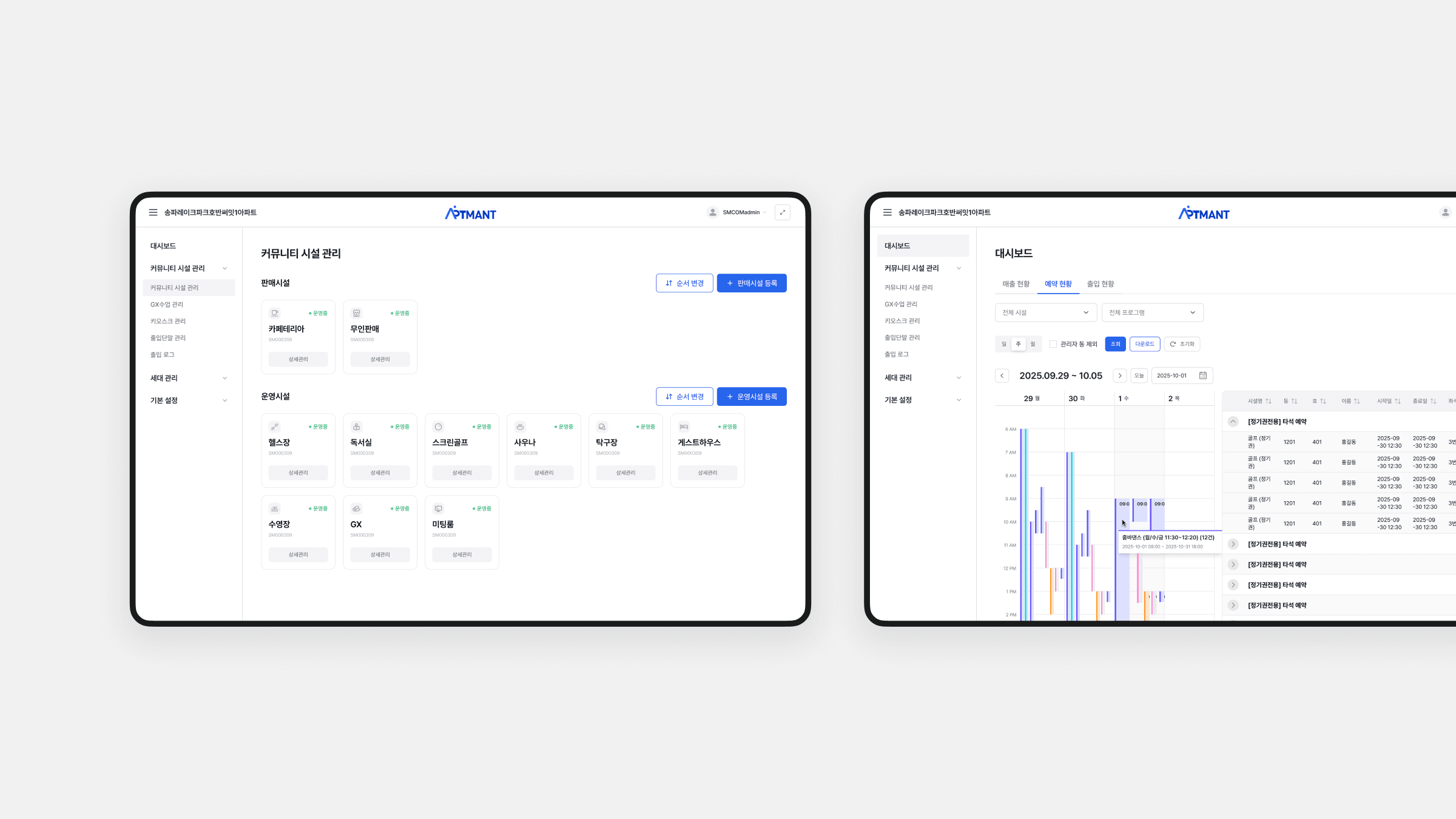 아파트 커뮤니티 시설과 입주민 서비스를 운영·관리하는 관리자 및 관리사무소 직원을 대상으로, 예약 현황, 시설 운영 시간, 쿠폰 및 결제 내역, 세대 관리, 이용 통계 등 다양한 정보를 빠르게 파악하고 처리할 수 있도록 설계한 웹 기반 관리자 어드민으로 정보 밀도가 높은 화면에서도 혼란을 줄이기 위해 명확한 레이아웃 그리드와 일관된 컴포넌트 규칙을 적용하고, 필터·테이블·캘린더 UI를 중심으로 반복 업무를 최소 클릭으로 수행할 수 있도록 UX 흐름을 단순화했습니다.