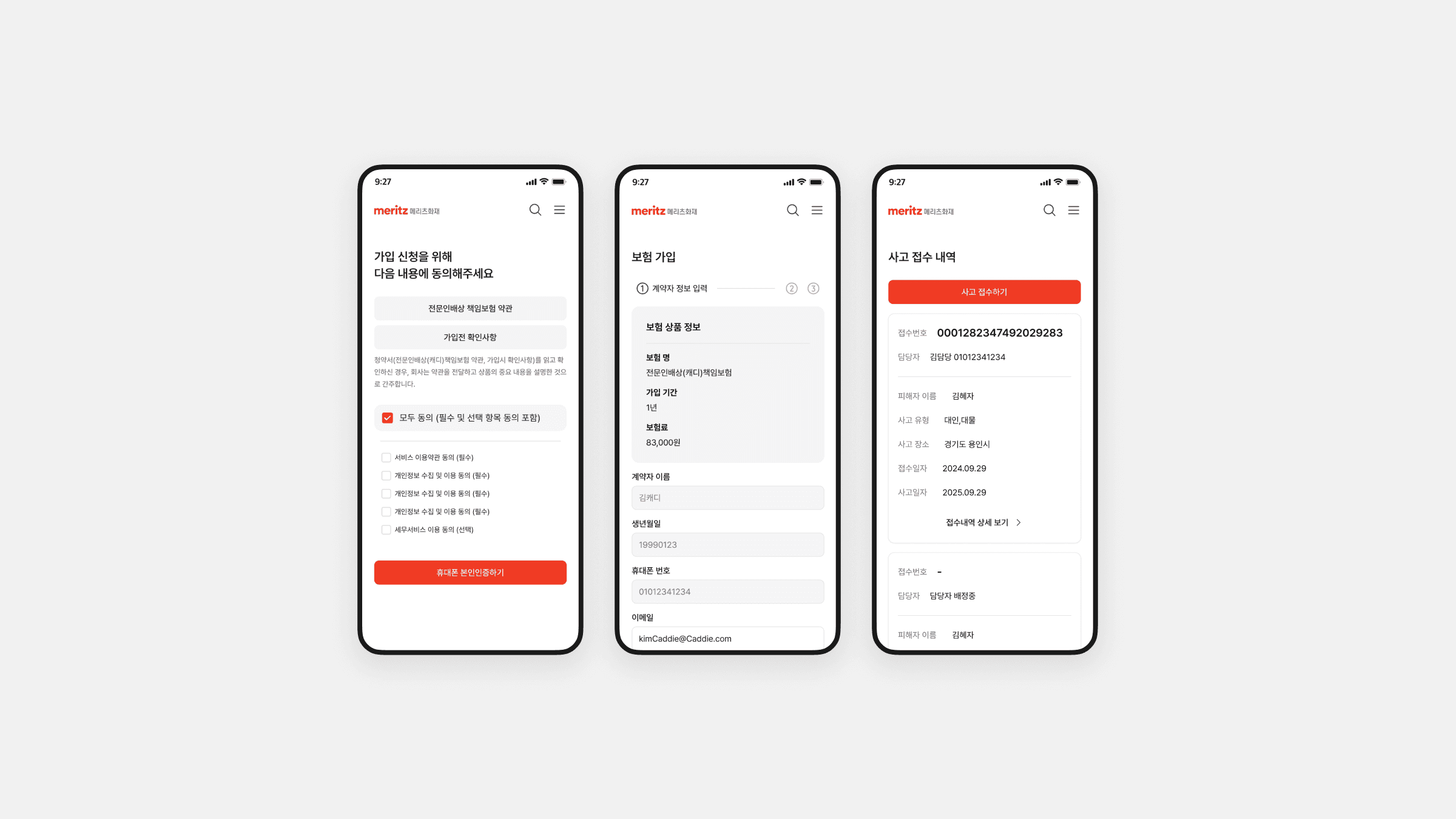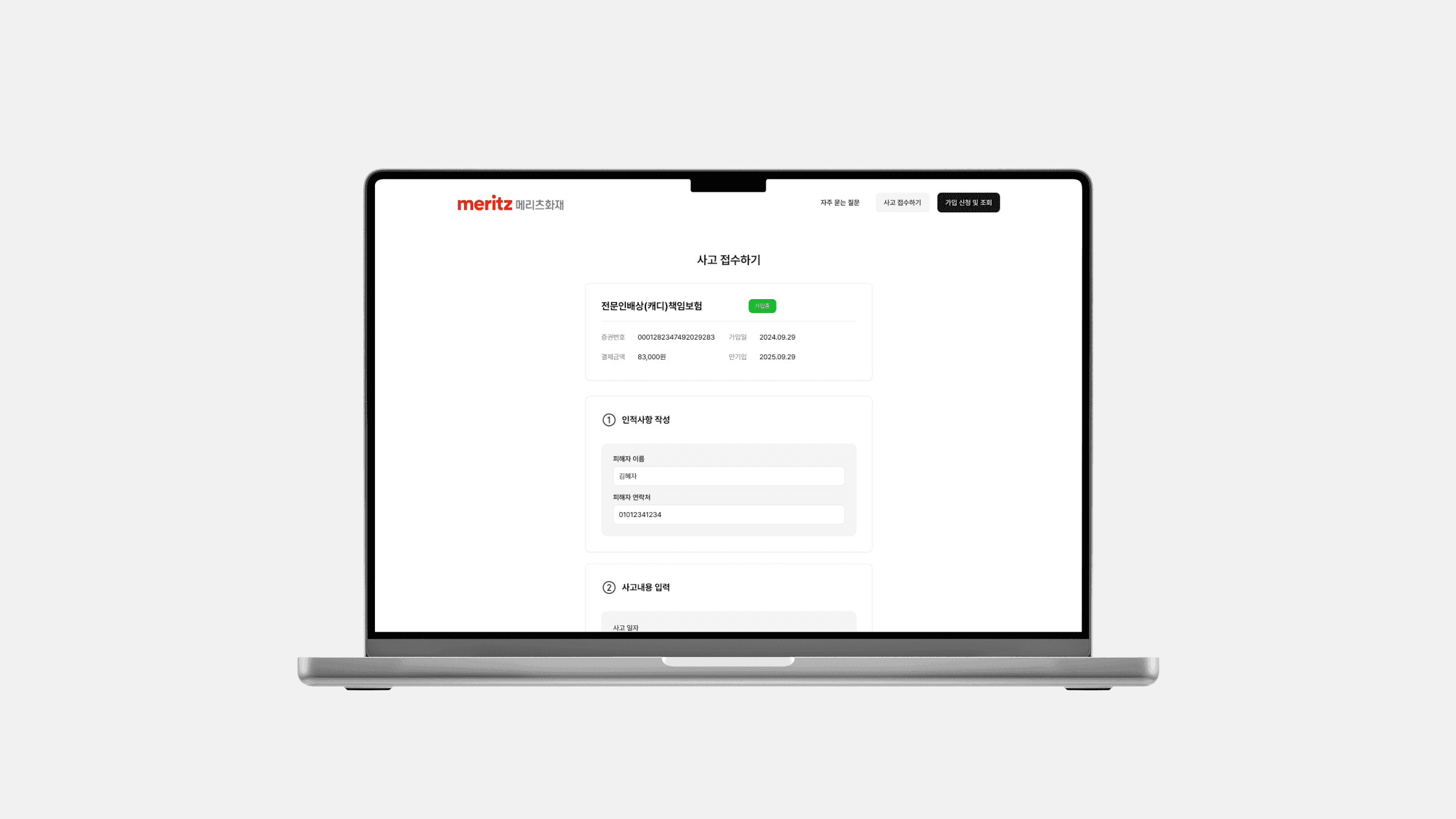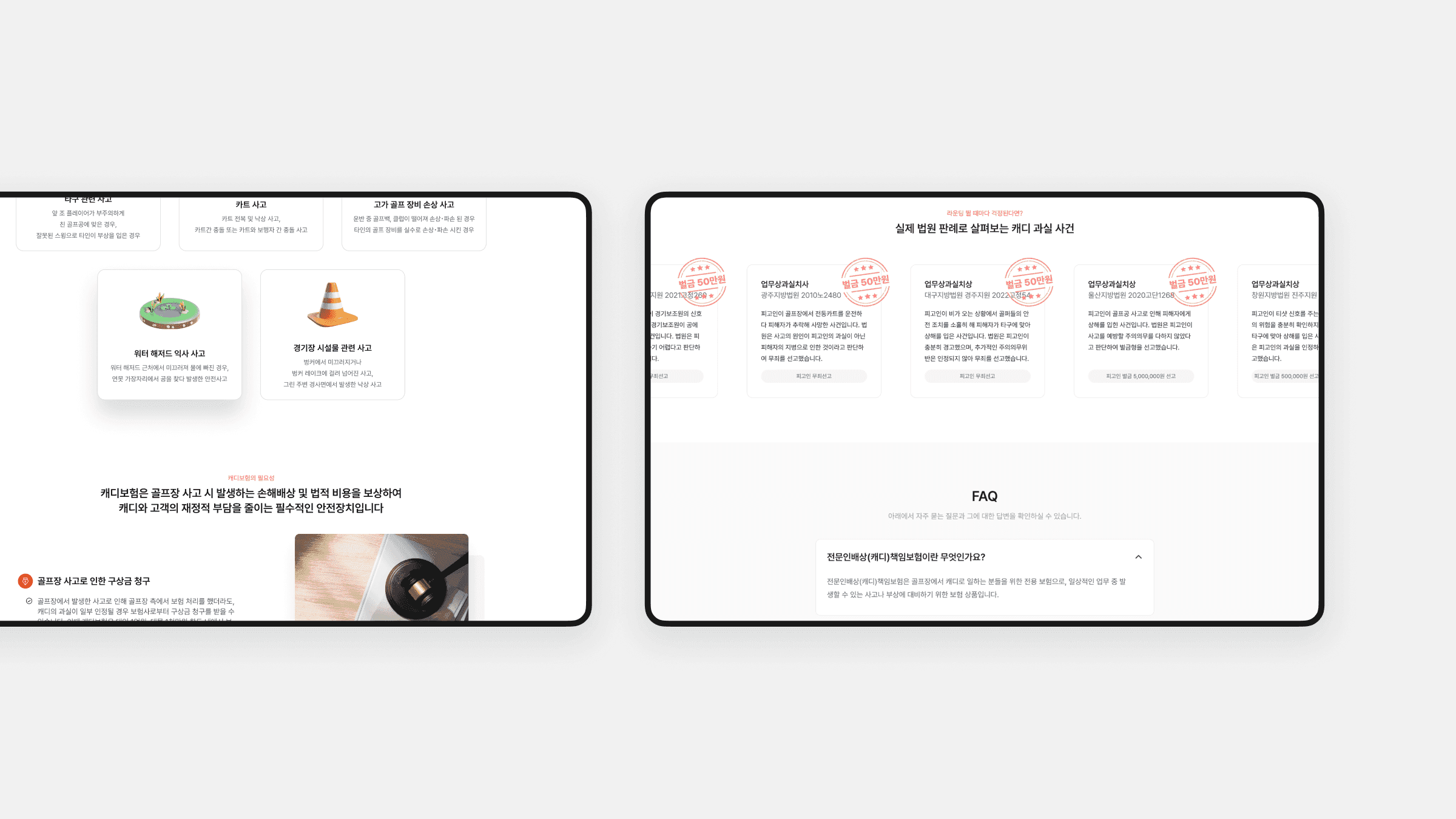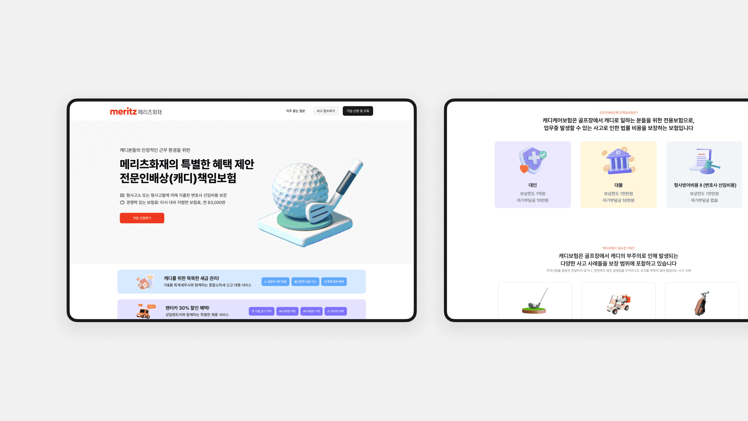 골프장 캐디 전용 보험 상품의 가입, 조회, 사고 접수를 온라인으로 지원하는 플랫폼입니다. 기획부터 UX/UI 설계, 협력사와의 전반적인 협업 조율까지 수행했습니다. 직관적인 사용자 흐름과 모바일 최적화에 중점을 두어, 사용자가 보험 정보를 빠르게 확인하고 사고를 명확하게 접수할 수 있도록 설계했습니다.