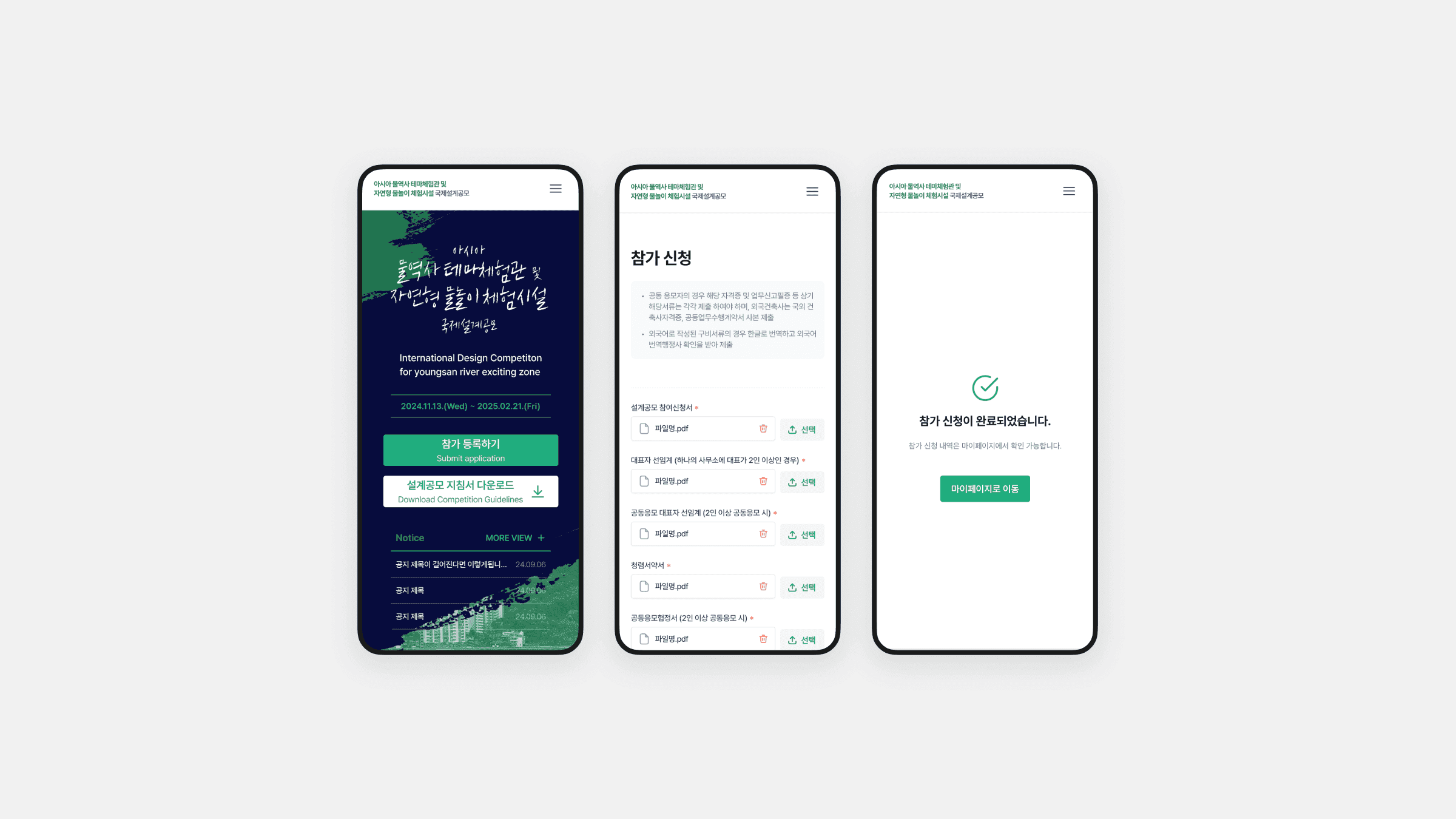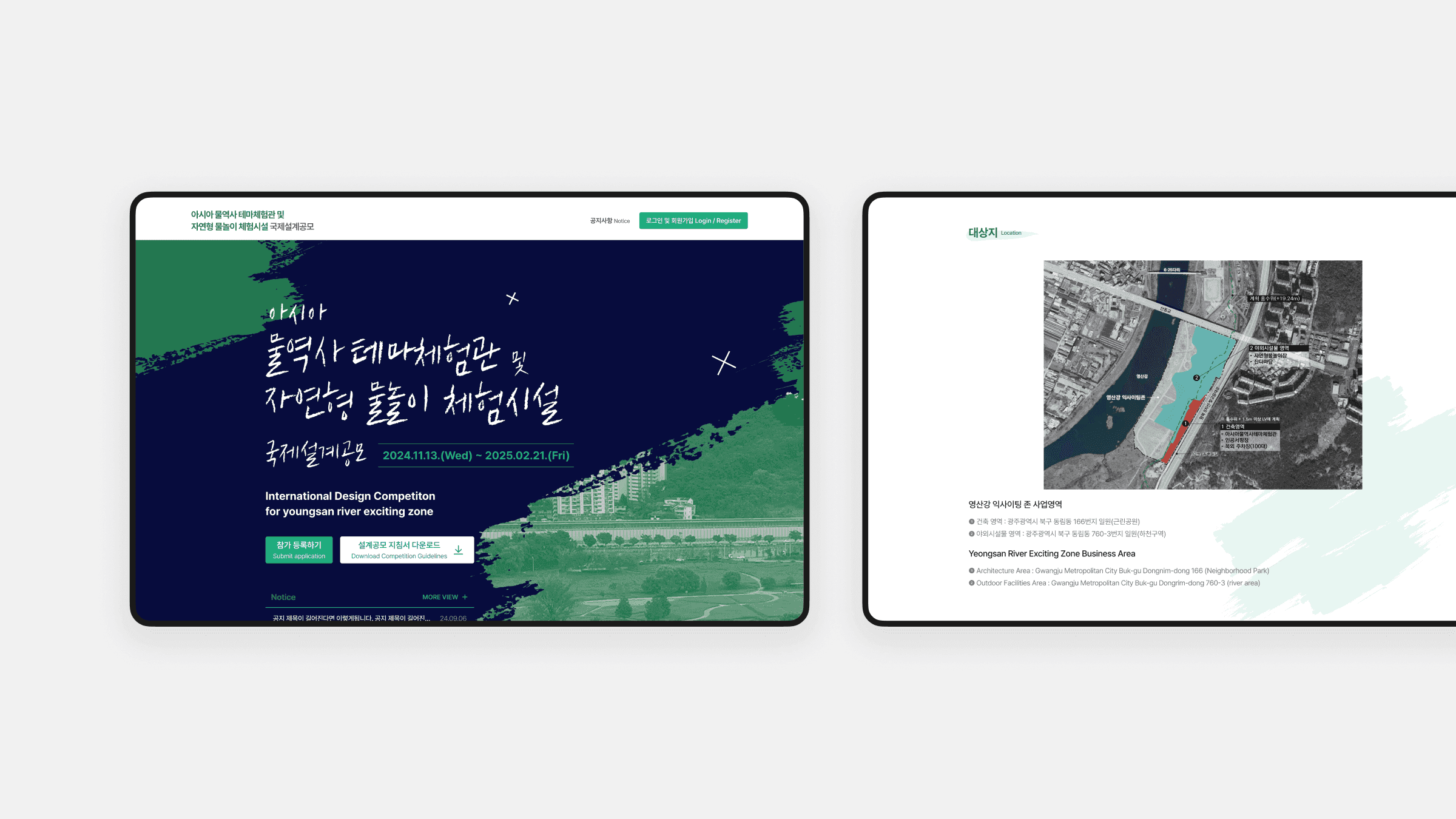 The official website for the International Design Competition for the Yeongsan River Exciting Zone, organized by the city of Gwangju, was designed and project-managed end to end. From rapid requirements gathering and UX planning to full UI design and coordination with the external development team, the entire process was handled to ensure smooth build and deployment. Despite a highly compressed timeline, a responsive and multilingual platform was delivered, supporting real-time registration, downloadable briefs, and live updates. The site architecture was optimized for the competition’s two-phase structure and enabled flexible content management throughout the operational period.