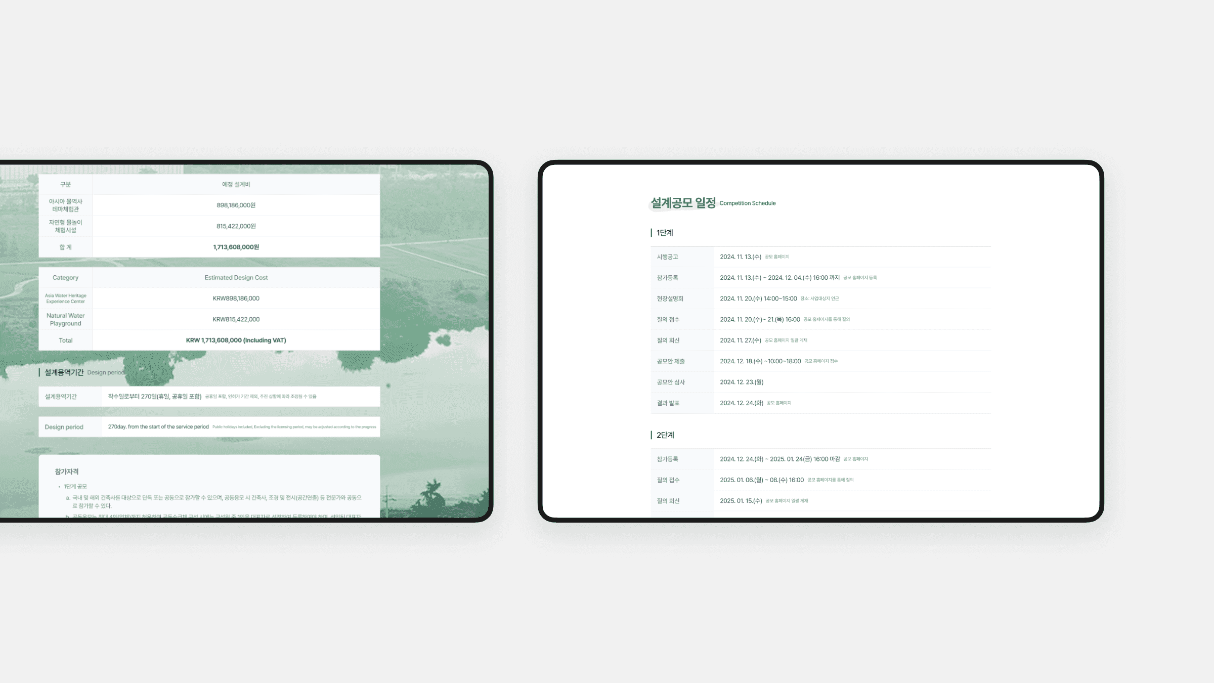 광주광역시가 주관한 영산강 익사이팅존 국제설계공모의 공식 웹사이트를 기획부터 디자인, PM까지 전반적으로 수행했습니다. 요구사항 정리와 UX 설계, 반응형 UI 디자인, 외부 개발사 협업을 통해 안정적인 구축과 배포를 이끌었습니다. 짧은 일정 속에서도 참가자 등록, 다국어 지원, 자료 다운로드, 실시간 공지 등 핵심 기능을 갖춘 플랫폼을 구현했으며, 1·2단계로 구성된 공모 운영 구조에 최적화된 정보 구조를 설계했습니다. 운영 기간 동안 유연한 콘텐츠 관리가 가능하도록 체계를 구축한 프로젝트입니다.