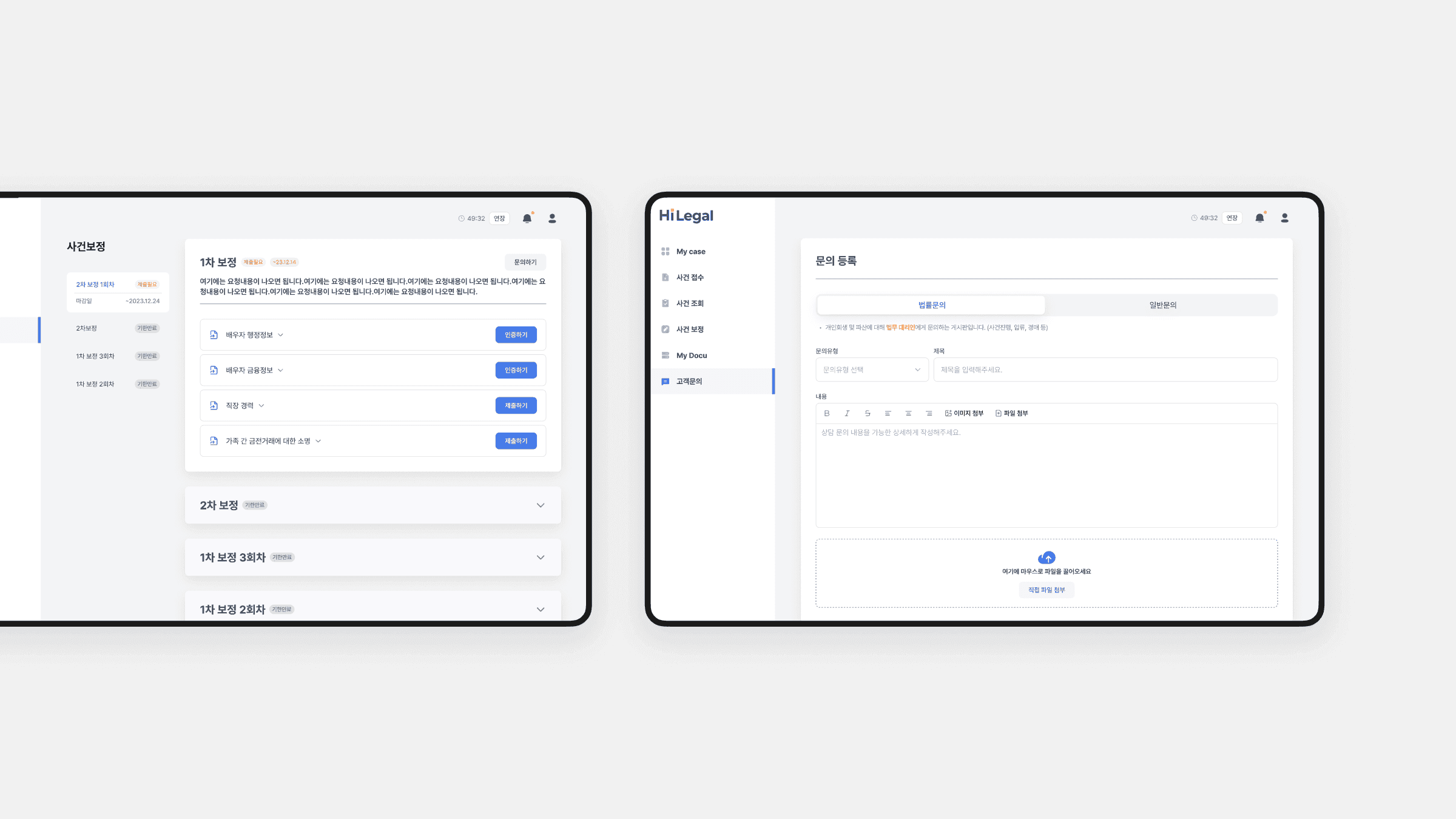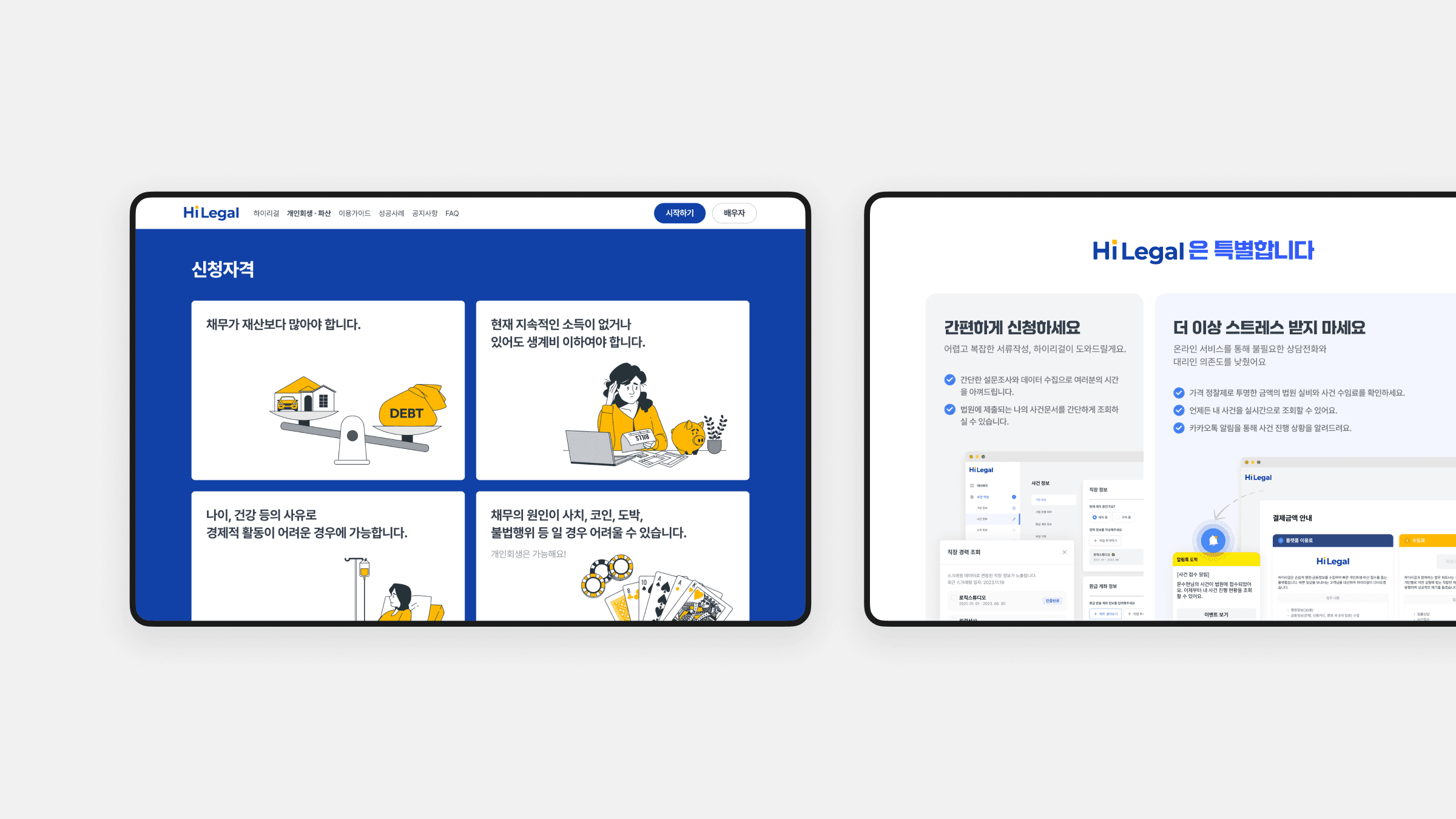 개인회생 및 파산 신청 절차를 디지털화한 리걸테크 플랫폼입니다. 본 프로젝트는 기획부터 UX/UI 설계, 어드민 대시보드 구축까지 전 과정을 수행하며 복잡한 법률 절차를 직관적인 사용자 흐름으로 재구성했습니다. 마이데이터 연동을 통해 정보 입력을 자동화하고 다단계 과정을 간소화하여, 사용자가 온라인에서 보다 쉽게 법률 지원을 받을 수 있도록 설계했습니다.
