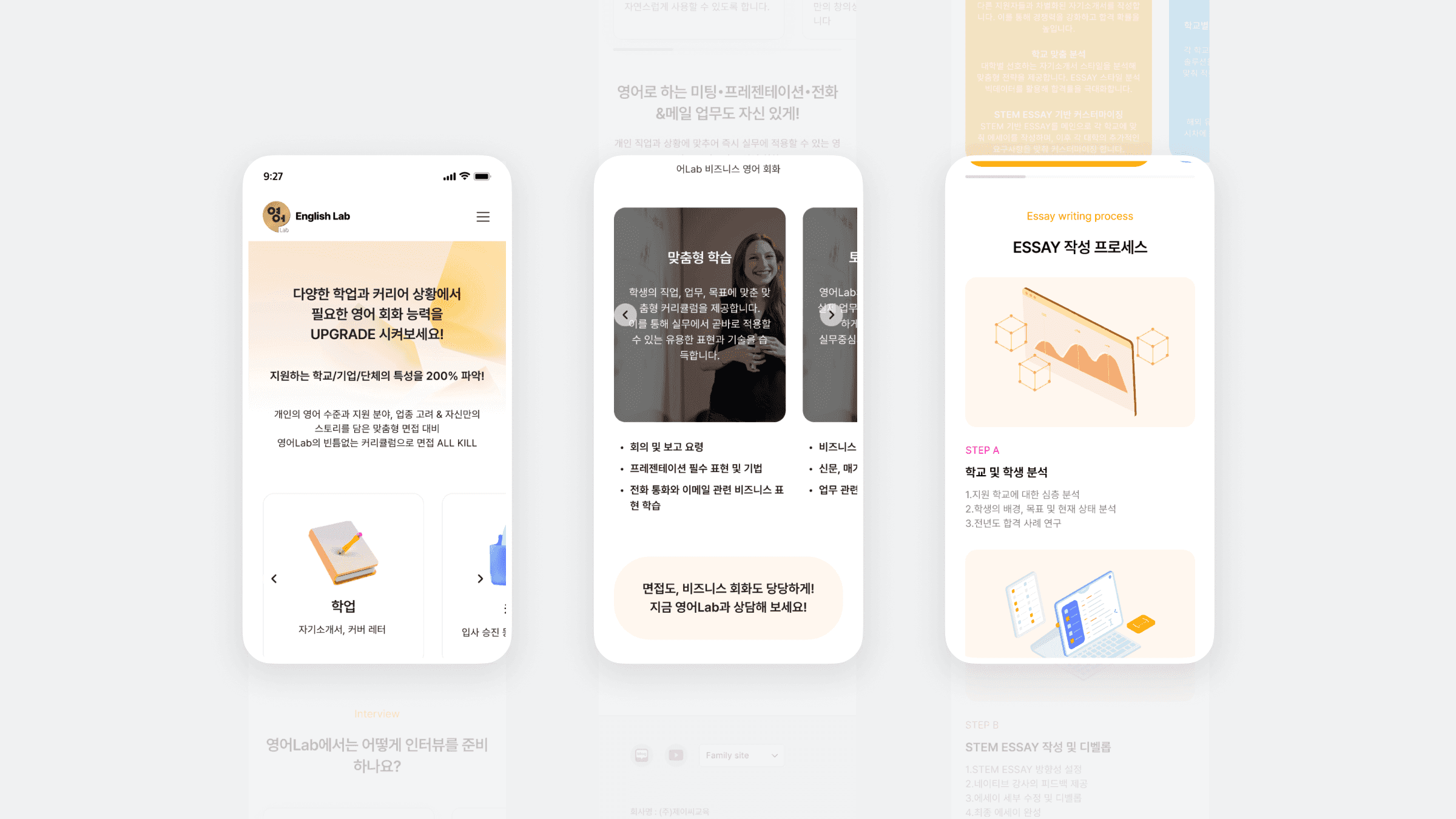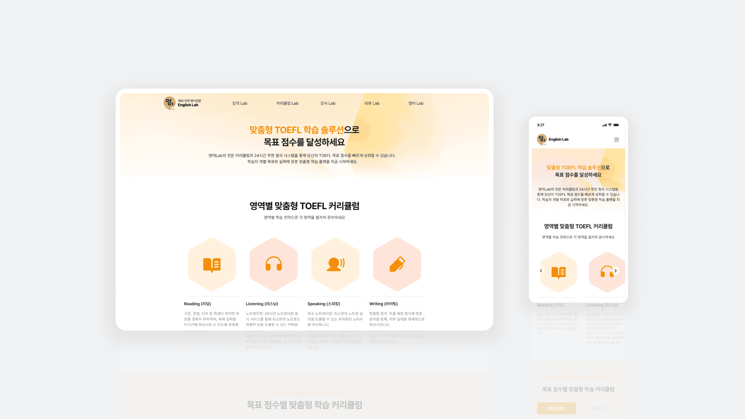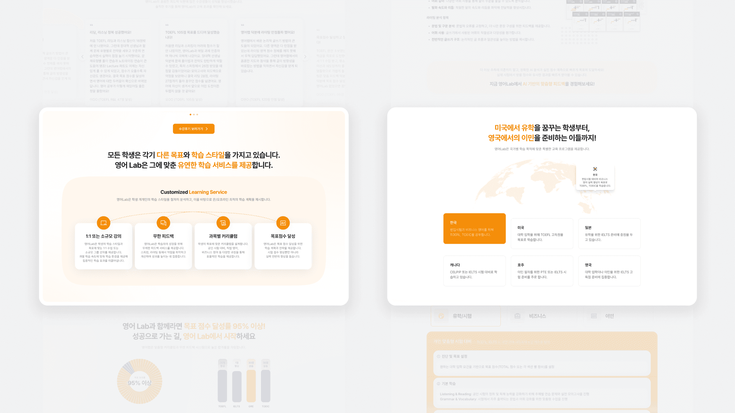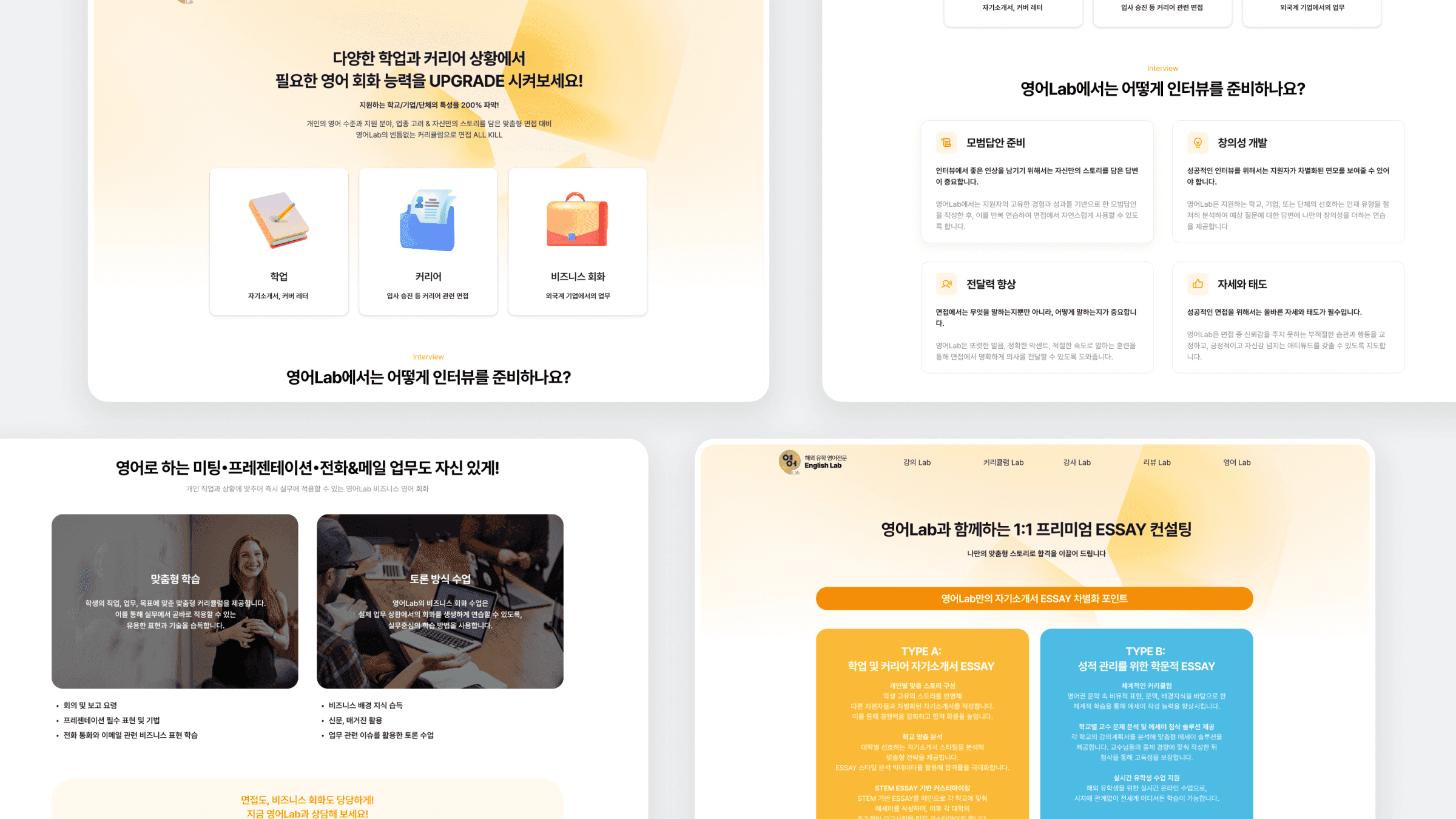 EnglishLab은 JC EDU의 맞춤형 영어 학습 서비스로, 토플 등 공인 시험 준비생과 특정 목표를 가진 학습자를 위한 교육 플랫폼입니다. 개인별 학습 설계, 1:1·소그룹 수업, 무제한 피드백, 목표 중심 커리큘럼 등 핵심 가치를 효과적으로 전달할 수 있도록 전체 웹사이트를 설계했습니다. 정보 구조 설계부터 UI 디테일까지 사용성과 전환을 중심에 두었으며, 학습자가 서비스 내용을 빠르게 이해하고 참여할 수 있도록 구성했습니다. 브랜드 전문성과 유연성을 반영한 반응형 학습 사이트로 완성되었습니다.