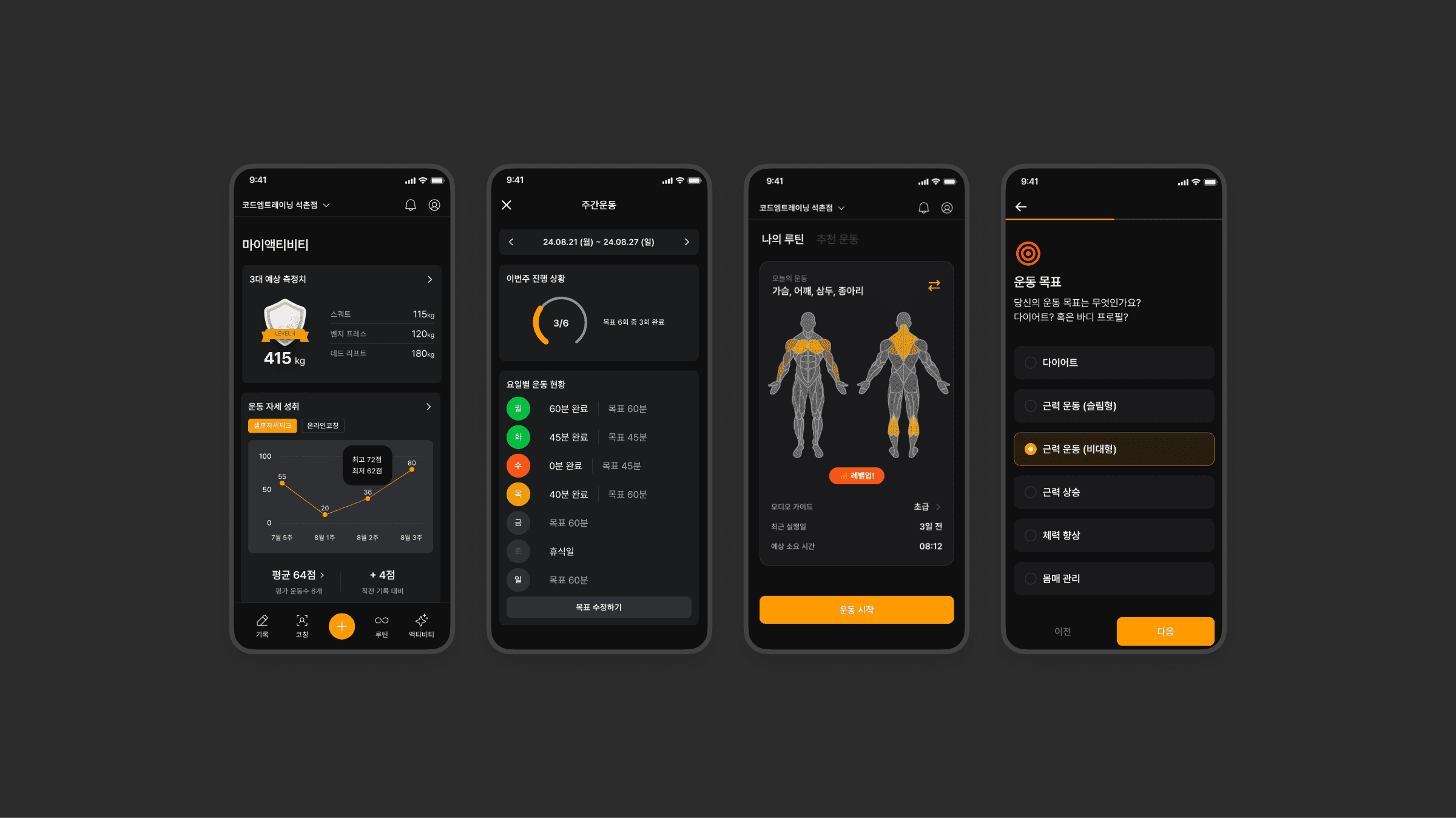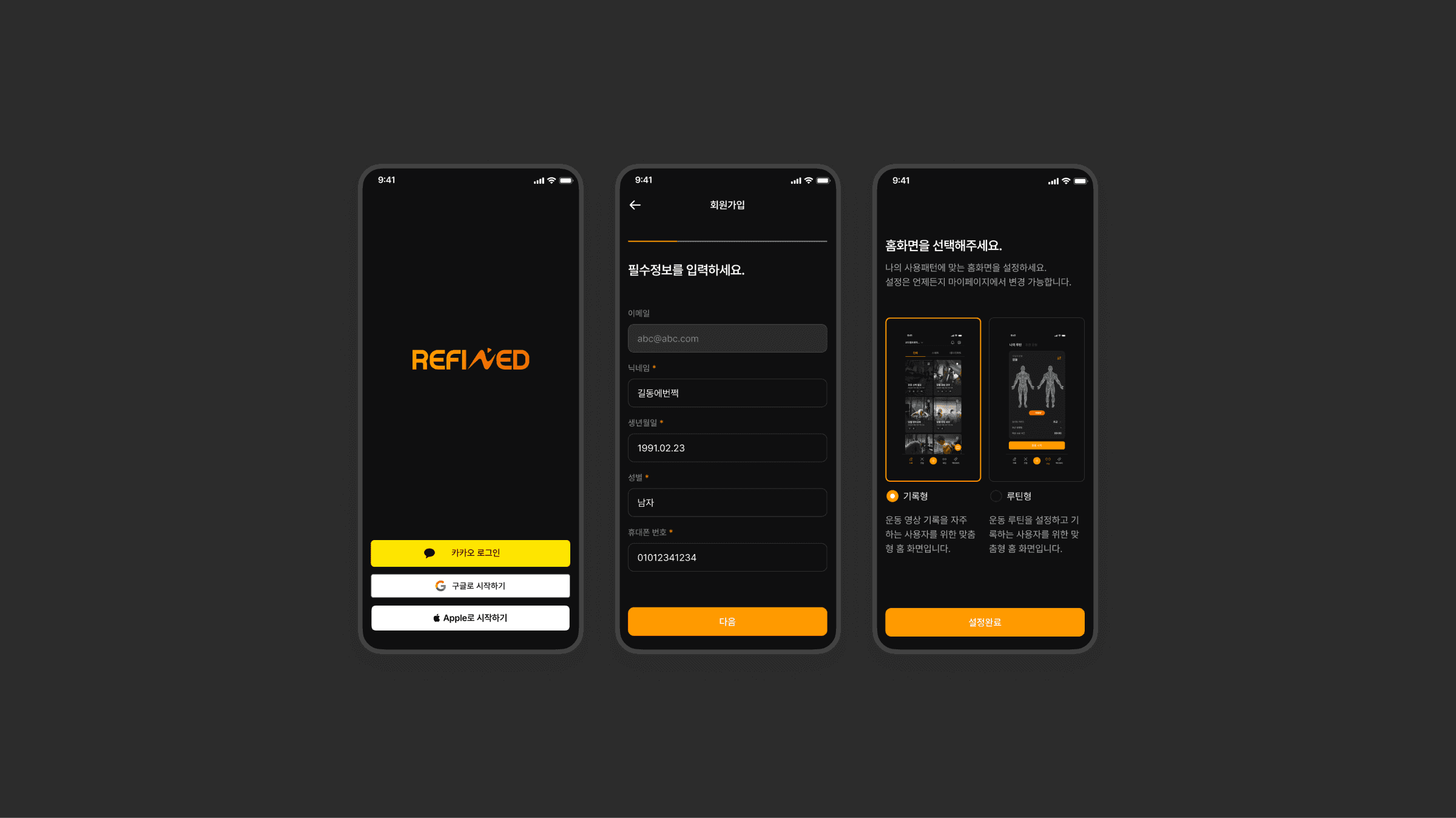 Refined는 운동 기록, 루틴 관리, 1:1 코칭을 통합한 피트니스 플랫폼입니다. 사용자, 사업자, 관리자 등 다양한 역할을 고려해 요구사항 정의부터 정보 구조 설계, UX/UI 디자인까지 전 과정을 수행했습니다. 복잡한 기능 구성을 리서치와 플로우 설계를 통해 직관적인 구조로 정리했으며, 다크 테마를 기반으로 실제 운동 공간의 분위기를 반영하면서도 가독성과 일관성을 유지했습니다. 모바일과 웹 전반에서 역할별로 최적화된 인터랙션을 제공하는 확장성 있는 멀티 유저 플랫폼으로 완성되었습니다.