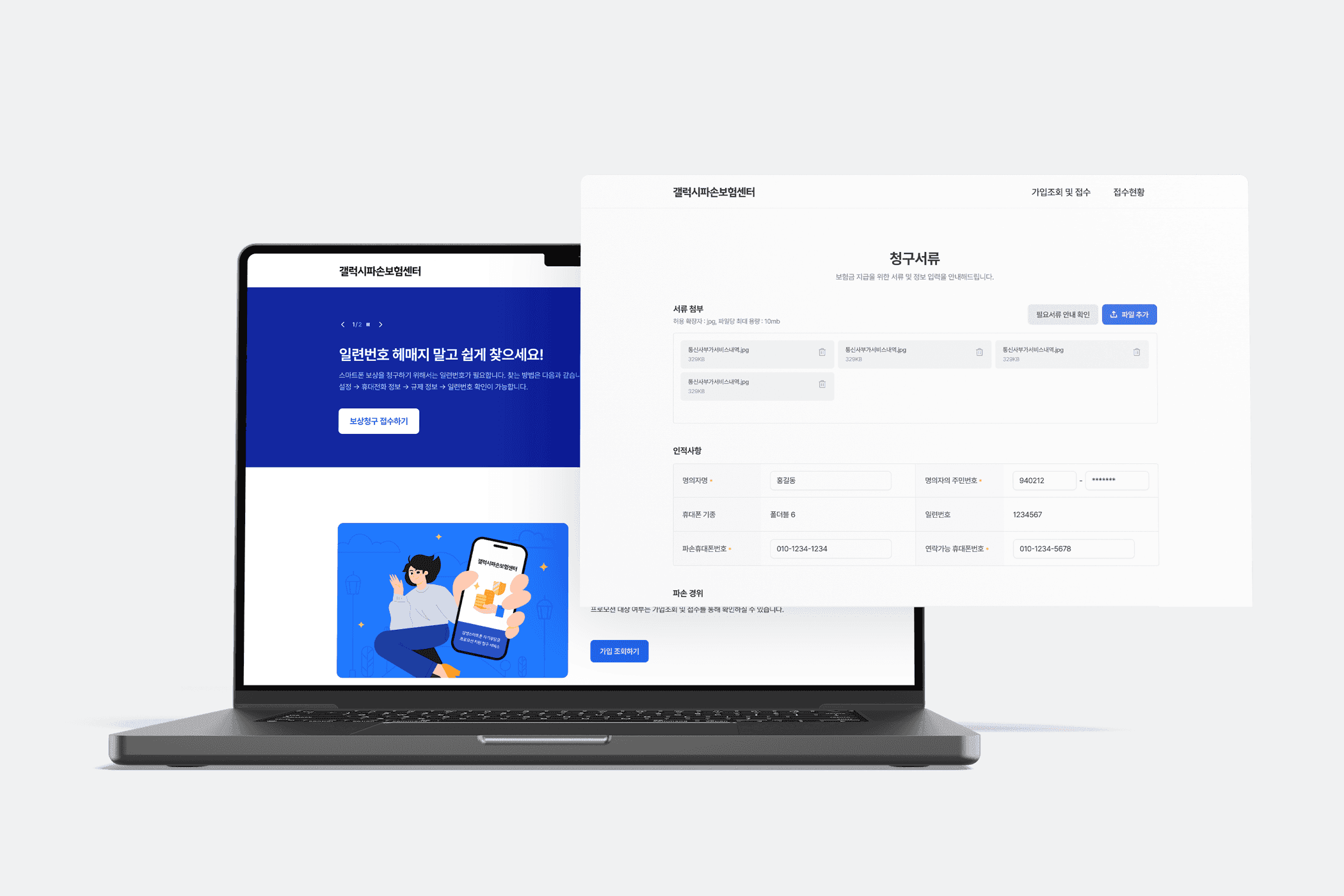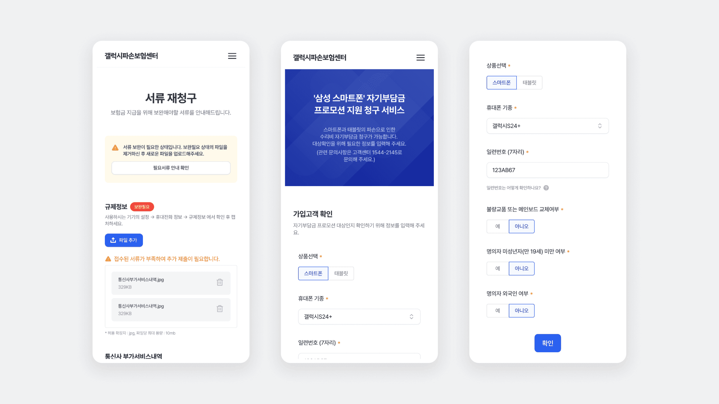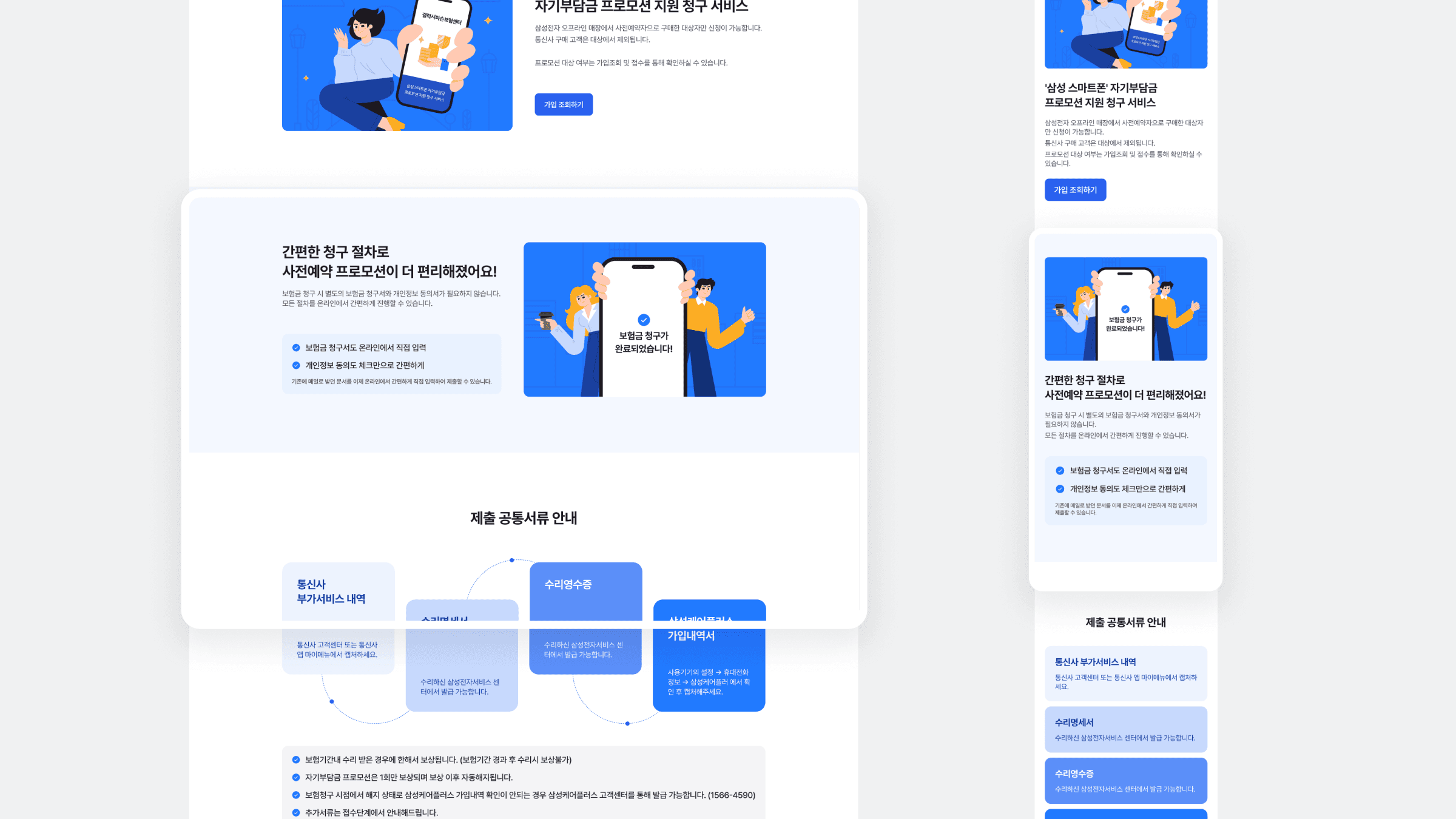 삼성 케어플러스 갤럭시 파손 보험센터 공식 웹사이트 구축을 전담하여, 요구사항 정리부터 UX 기획, UI 디자인, 제작 관리까지 전 과정을 리딩했습니다. 모바일 우선의 반응형 구조로 삼성 브랜드의 신뢰성을 반영하고, 파손 보험 서비스의 효율적인 운영을 지원하는 구조로 설계했습니다. 개발은 협력사와의 파트너십으로 진행되었으며, 프로젝트 매니지먼트는 헤엄이 주도했습니다.