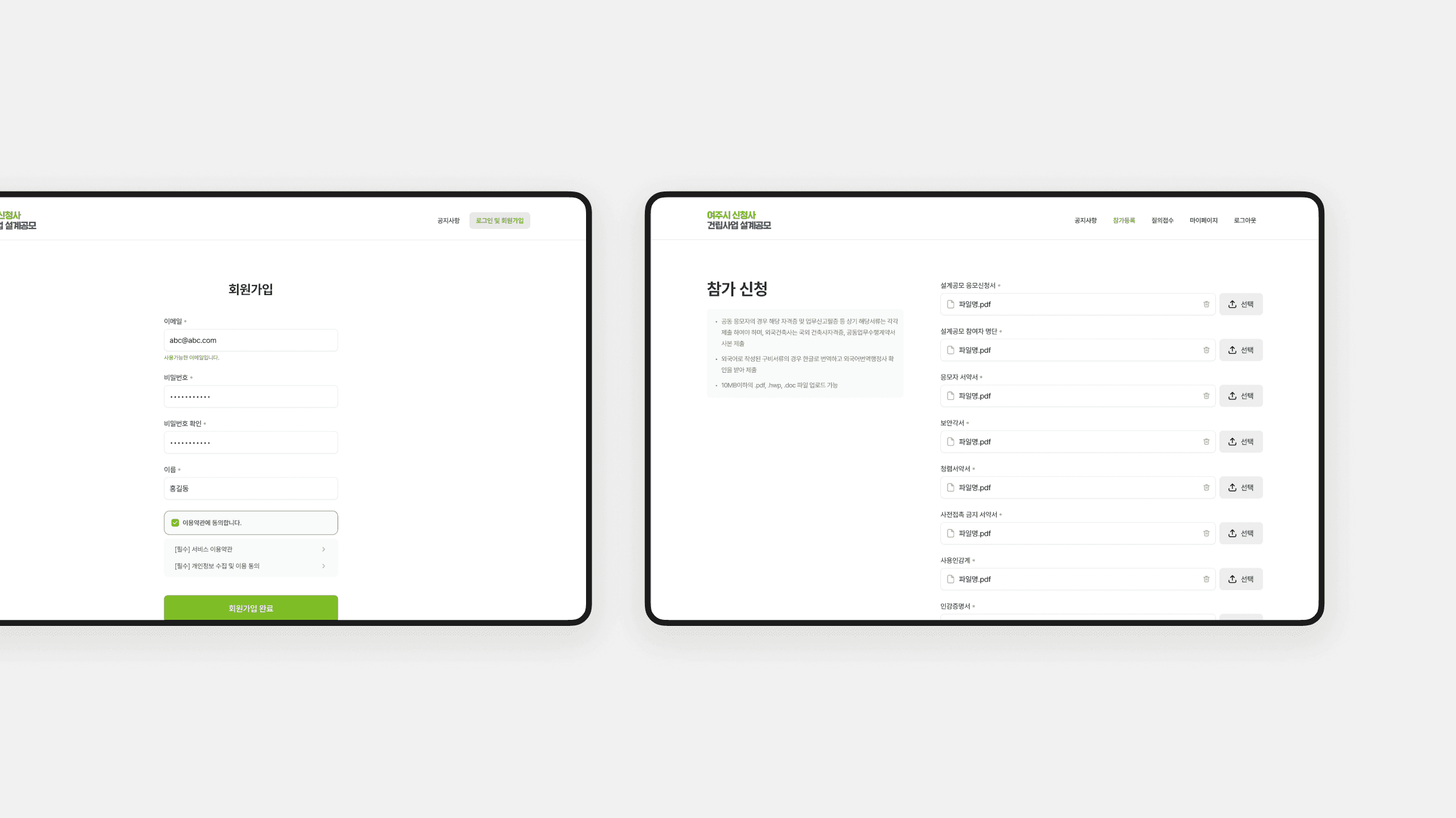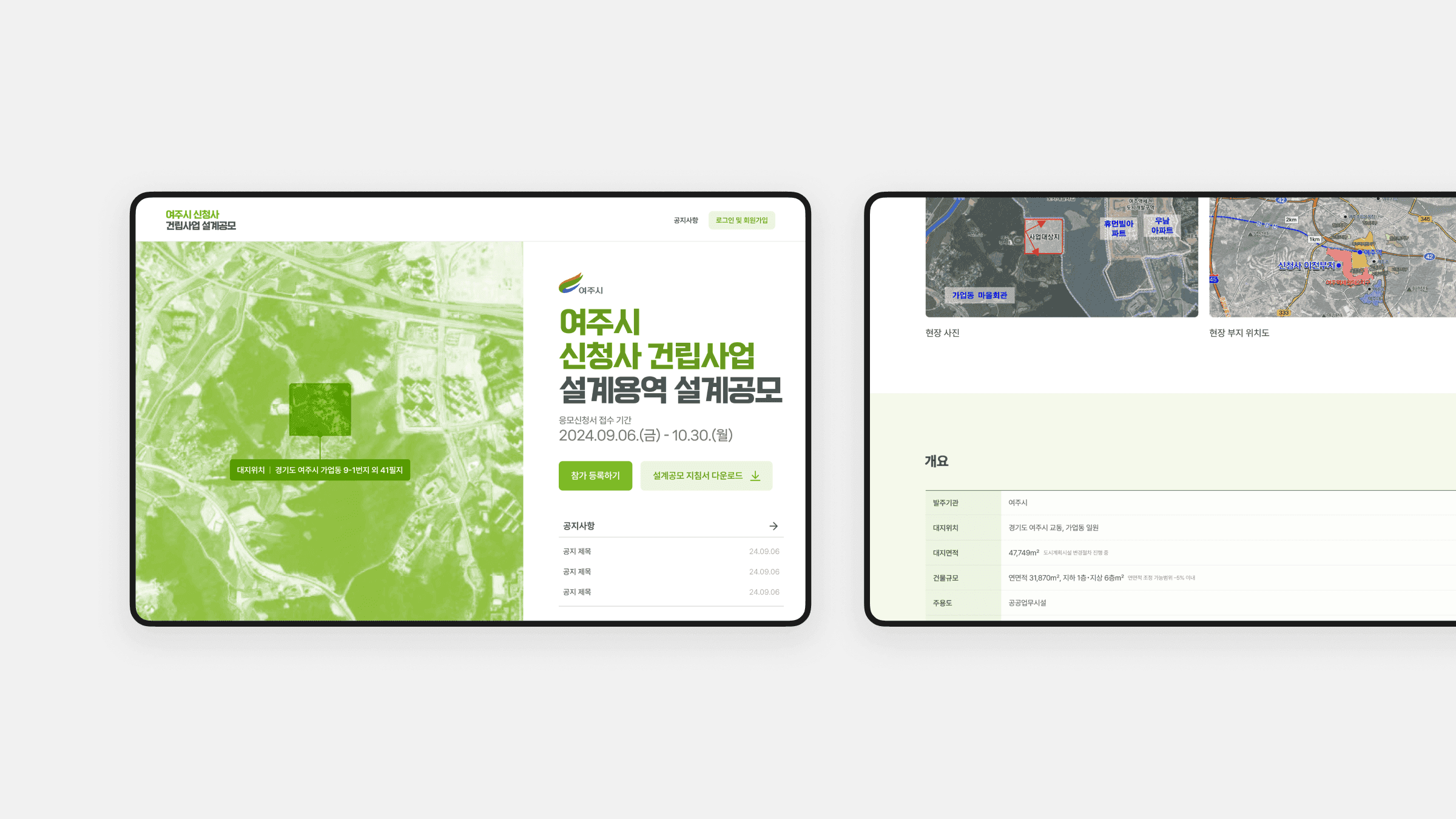 여주시가 주관한 여주시 신청사 국제설계공모의 공식 웹사이트를 기획부터 디자인, PM까지 전반적으로 수행했습니다. 요구사항 정리와 UX 설계, 반응형 UI 디자인, 외부 개발사 협업을 통해 안정적인 구축과 배포를 이끌었습니다. 짧은 일정 속에서도 참가자 등록, 다국어 콘텐츠 제공, 자료 다운로드, 공모 일정 관리 등 핵심 기능을 갖춘 플랫폼을 구현했으며, 1·2단계로 구성된 공모 운영 구조에 최적화된 정보 체계를 설계했습니다. 운영 기간 동안 유연한 콘텐츠 관리가 가능하도록 구조화한 프로젝트입니다.
